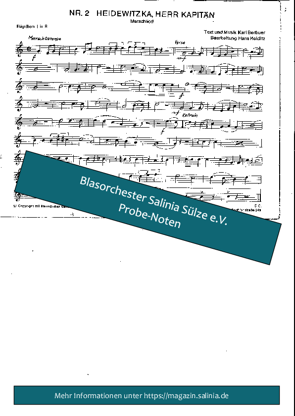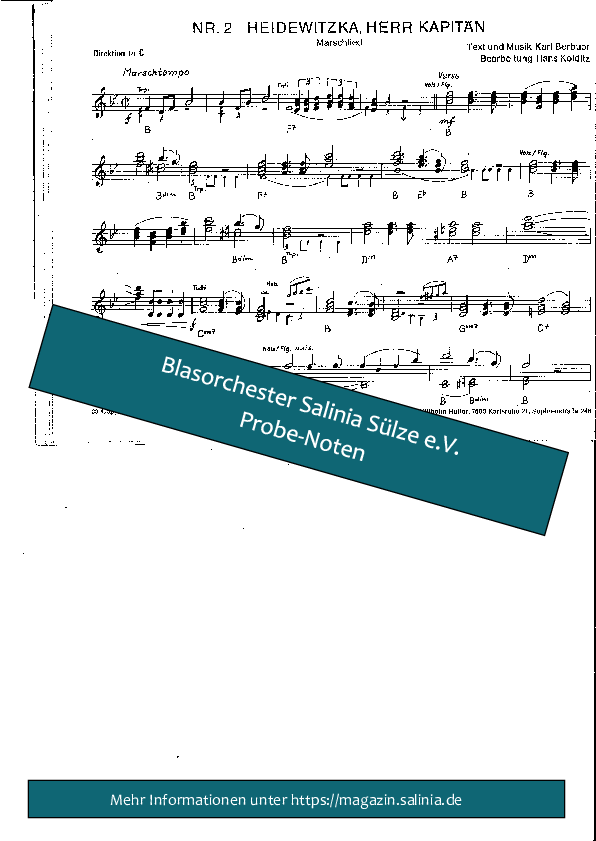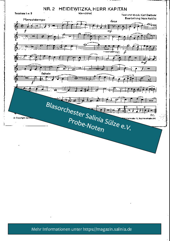Hier finden Sie Vorschaubilder und Beispielnoten im PDF Format zum Stück Heidewitzka Herr Kapitänzum Download. Dies sind nur Beispielseiten, die Originalnoten unterliegen dem Copyright der jeweiligen Verlage.