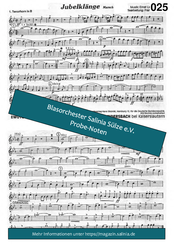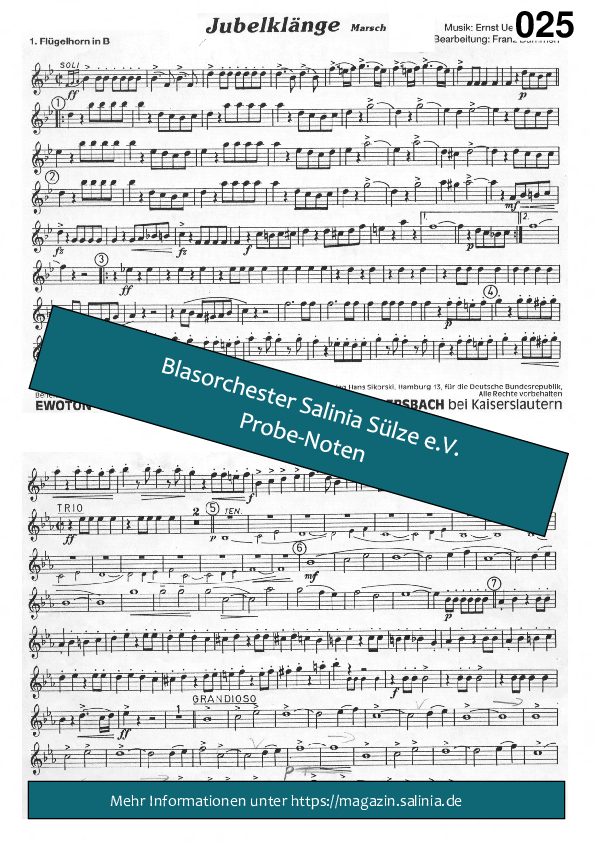 Hier finden Sie Vorschaubilder und Beispielnoten im PDF Format zum Stück Jubelklänge arr. Bummerlzum Download. Dies sind nur Beispielseiten, die Originalnoten unterliegen dem Copyright der jeweiligen Verlage.